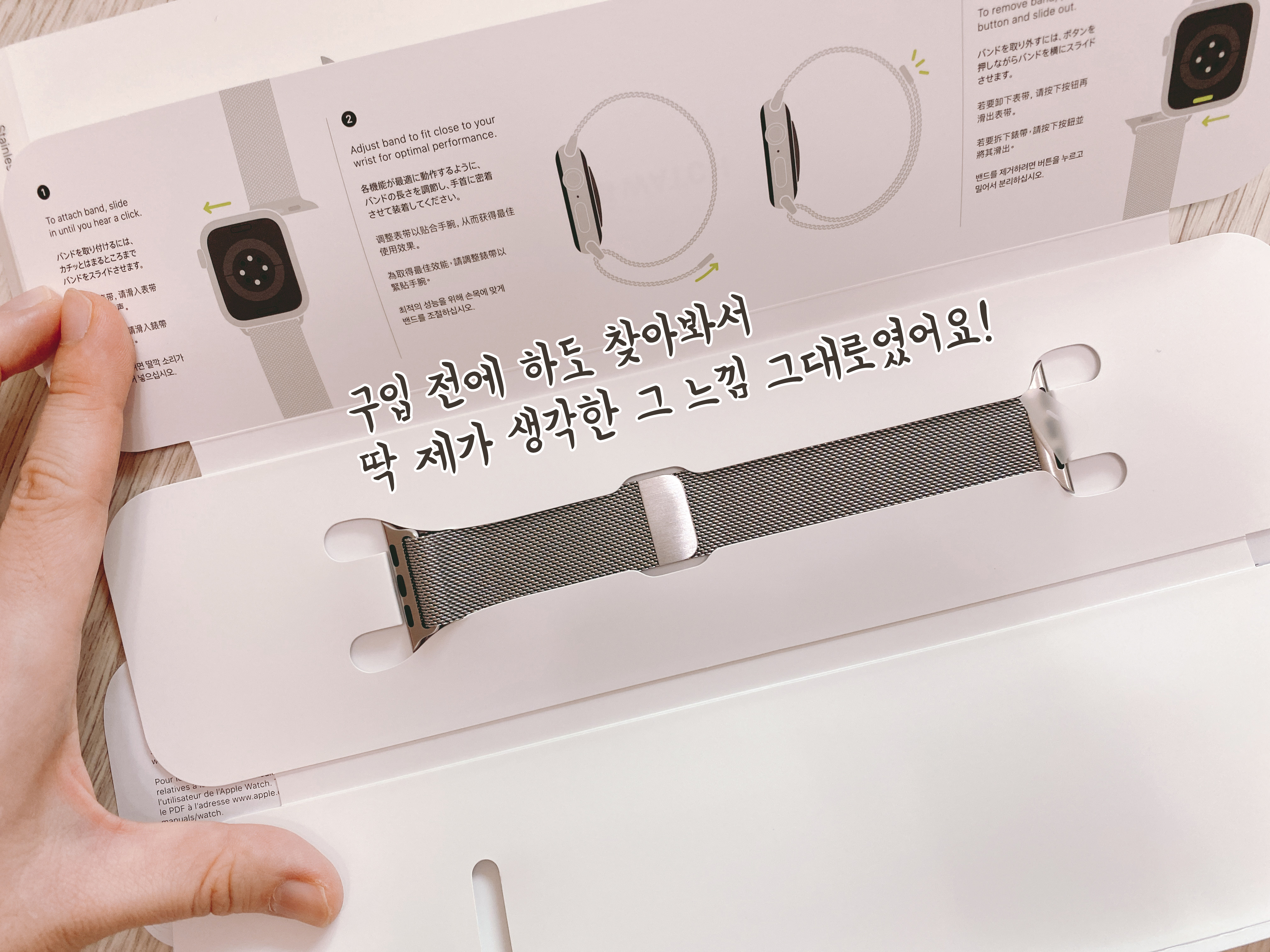 그럼 이제 제가 사용 중인 워치랑 체결을 한 번 해볼께요! 이것도 반대로 끼우거나 하면 뻑뻑하게 들어가고 그러면서 기스나고 그런다고 해서 저 위에 그림으로 체결방법을 직관적으로 보여주는데요. 저걸 보면서 차근차근 끼웠습니다.
