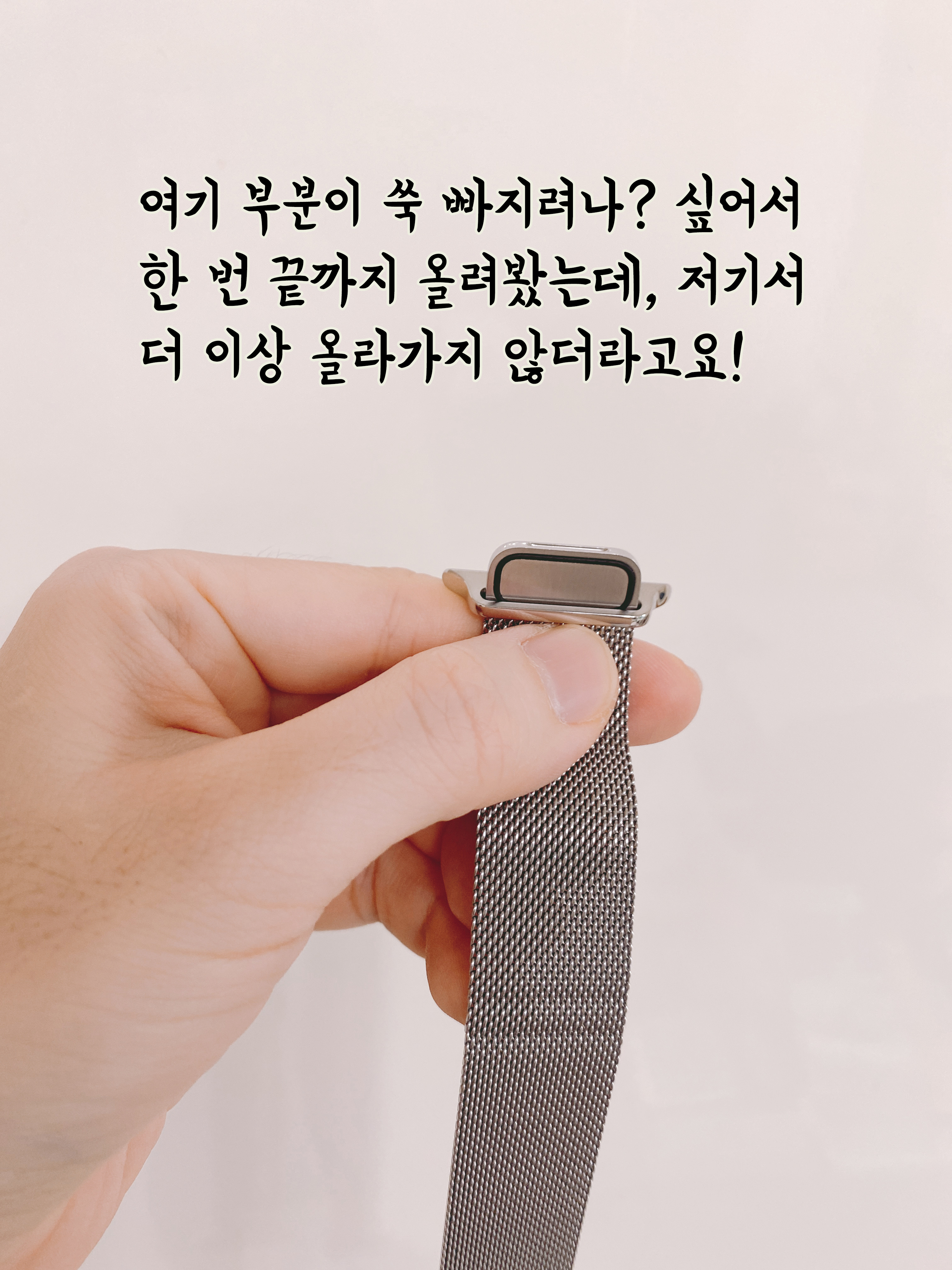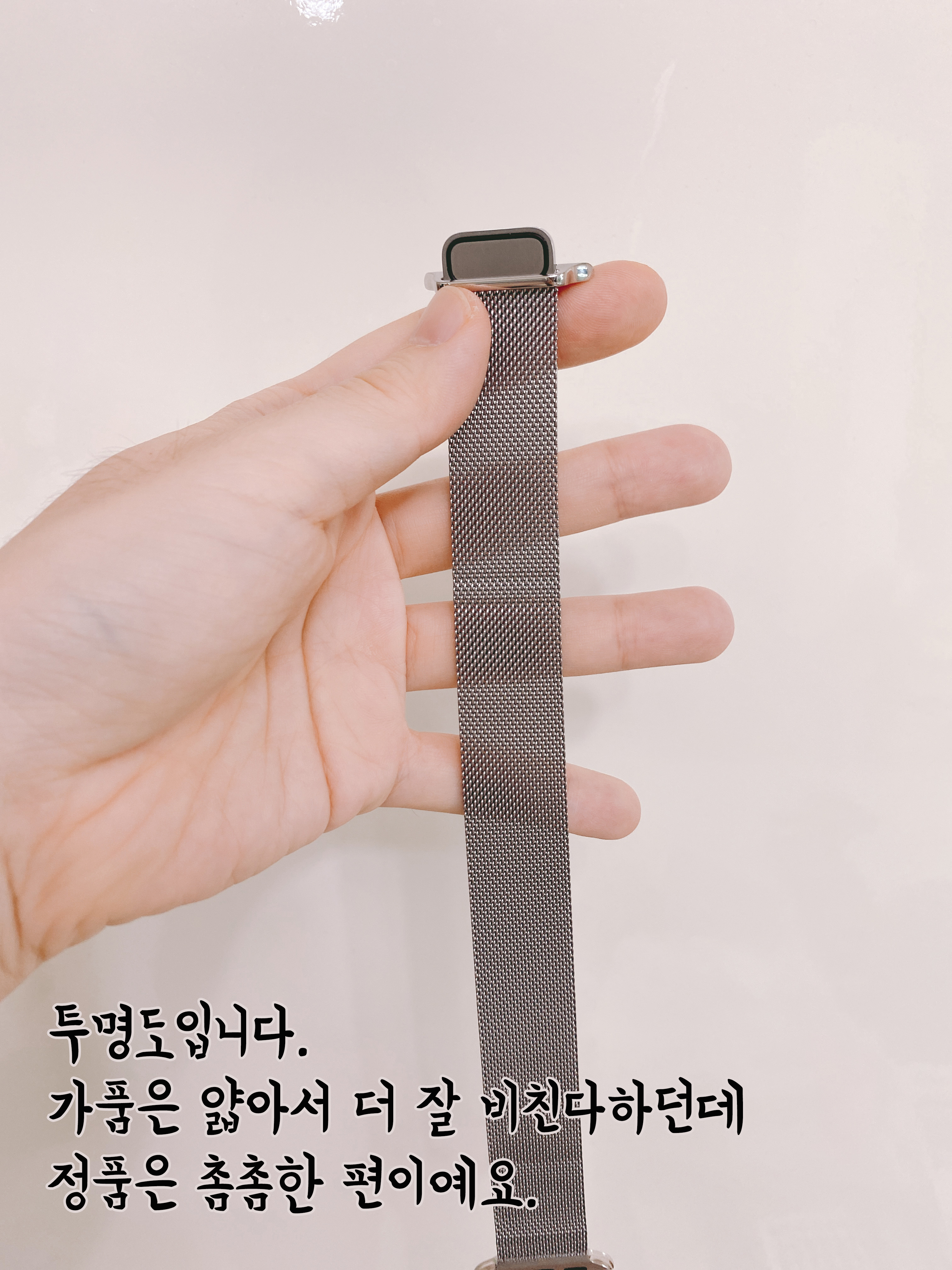 그리고 초반에 작성하기도 했지만, 가품은 줄이 정품에 비해 긴 편이라서 저 체결되는(자석) 부위가 손목을 한바퀴 돌고 붙더라고요. 그 모습이 너무 안예뻐서 아예 처음부터 정품을 염두했어요!