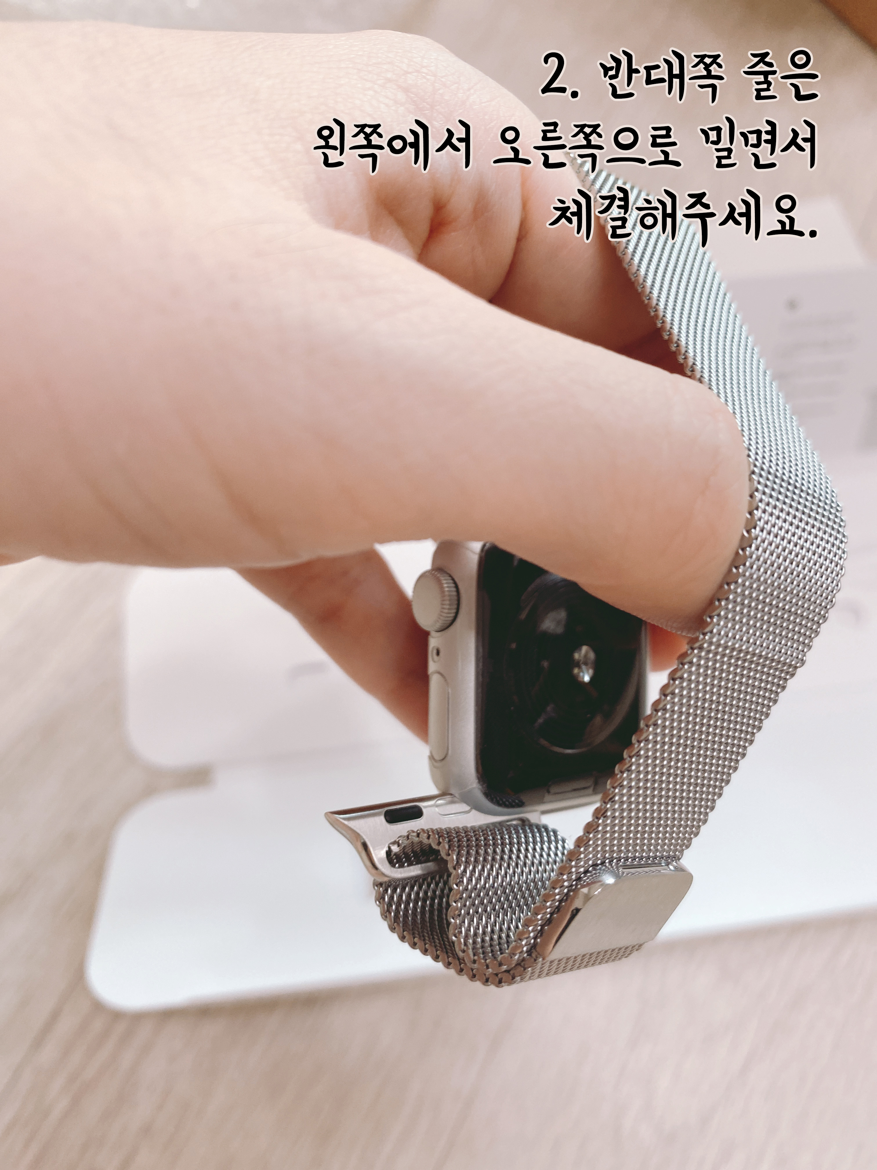 이렇게 순서대로 결합해주시면 됩니다! 워치를 제가 잡은 딱 저모양 대로 돌려주셔서 뒷면을 보면서 체결해주시면 되요!