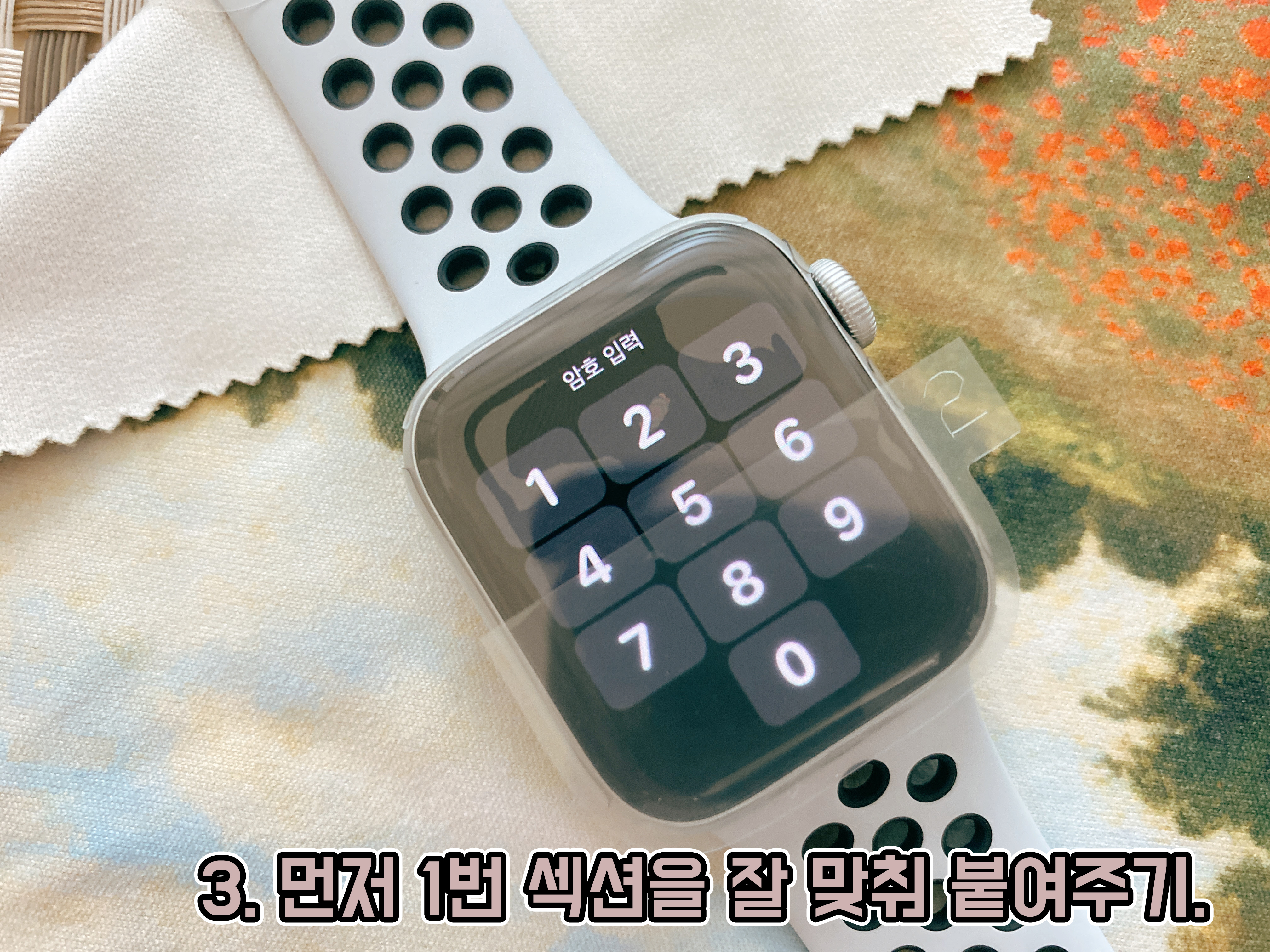 그리고 액정 필름이 1번/2번 섹션으로 나뉘어 붙이게 되어있어서, 1번 섹션을 잡고 뒤로 밀어서 스티커를 벗겨준 다음 잘 맞추어서 붙여주세요! 붙이고 나면 워치 테두리쪽이 들뜨는 느낌이 나는데, 이건 아래 2번째 섹션까지 붙여주고 앞 필름을 벗겨주면 해결이 되는 부분이라서 지금은 크게 신경 쓰지 않으셔도 됩니다.